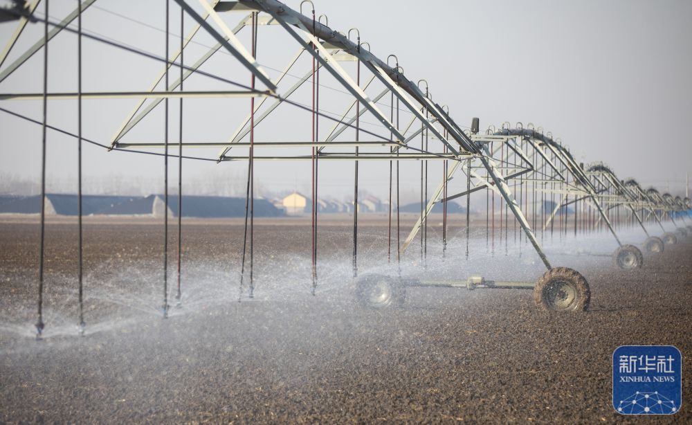 ↑ 12月6日,在山东省东营市广饶县李鹊镇,喷灌机浇灌冬小麦(无人机照片)。新华社发(刘云杰摄)