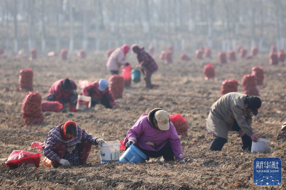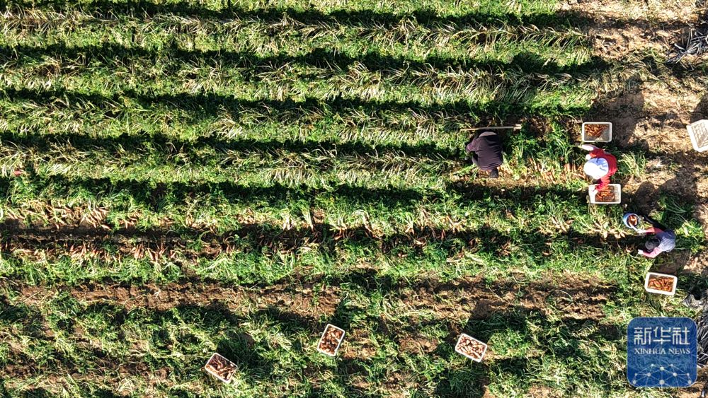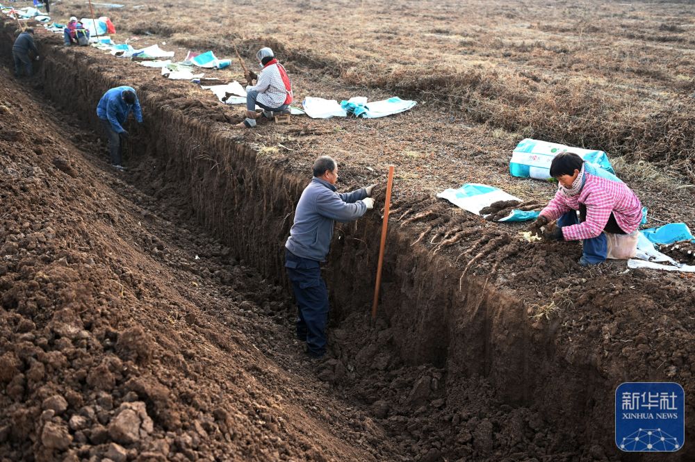 ↑ 12月6日,河南省焦作市温县黄河街道东张王庄村农民在田间收获怀地黄。新华社发(徐宏星摄)