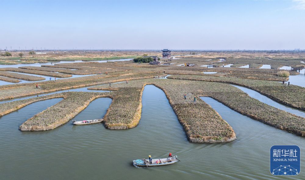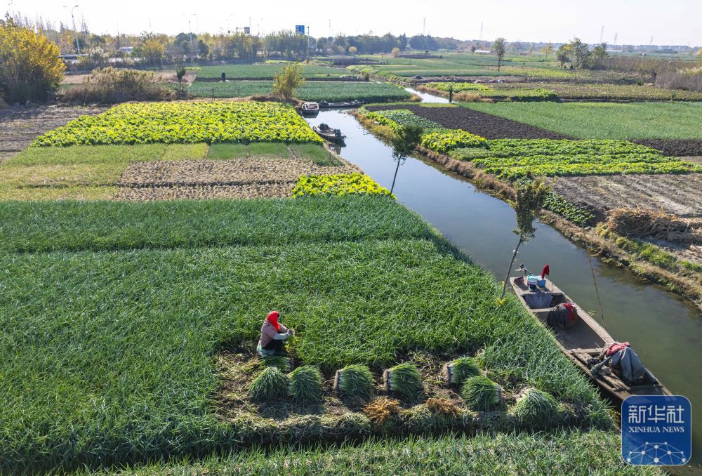 ↑ 12月6日,农民在江苏省兴化市垛田街道收获香葱(无人机照片)。新华社发(周社根摄)