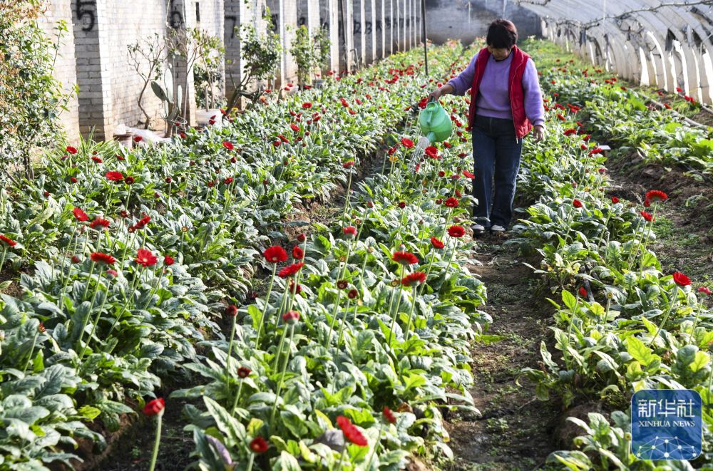↑ 12月6日,河南省济源市思礼镇涧南庄村农民在温室大棚里管理非洲菊。新华社发(苗秋闹摄)