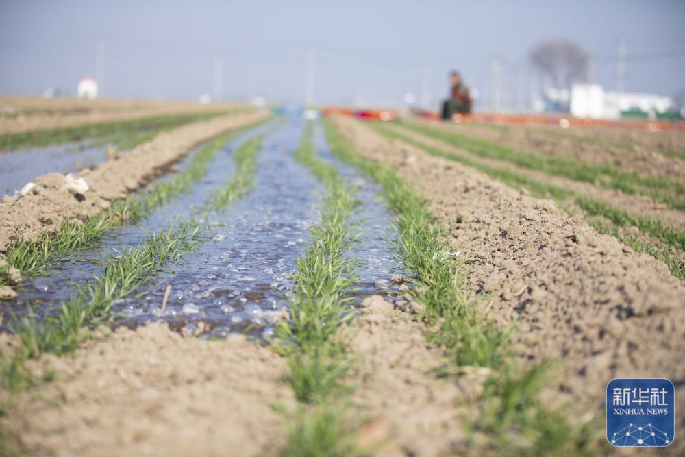 ↑ 12月6日,在山东省东营市广饶县李鹊镇,农民浇灌冬小麦。新华社发(刘云杰摄)