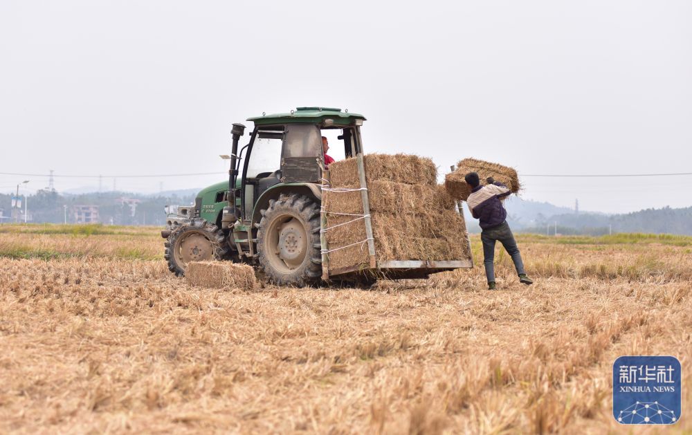 ↑ 12月5日,广西壮族自治区贺州市平桂区道西村农民驾驶拖拉机打包回收稻田秸秆。新华社发(廖祖平摄)