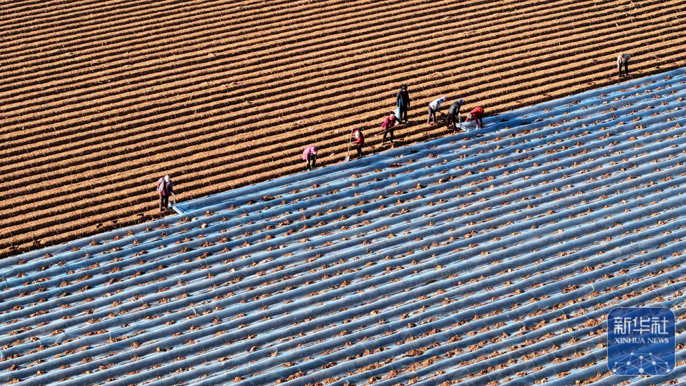 ↑ 12月6日,在山东省临沂市平邑县临涧镇,农民为蔬菜幼苗覆盖保温薄膜(无人机照片)。新华社发(武纪全摄)