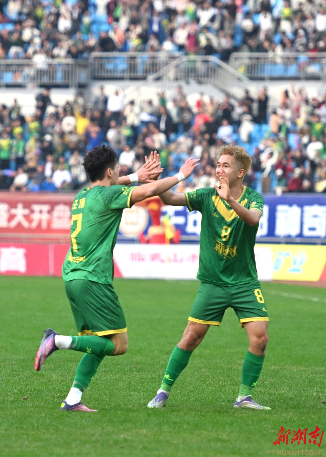 12月6日,球员在进球后庆祝。当天,2025湘超联赛第十三轮比赛,郴州队主场对阵衡阳队,最终以3:1完胜对手,一起携手挺进八强淘汰赛。湖南日报全媒体记者 郭立亮 摄