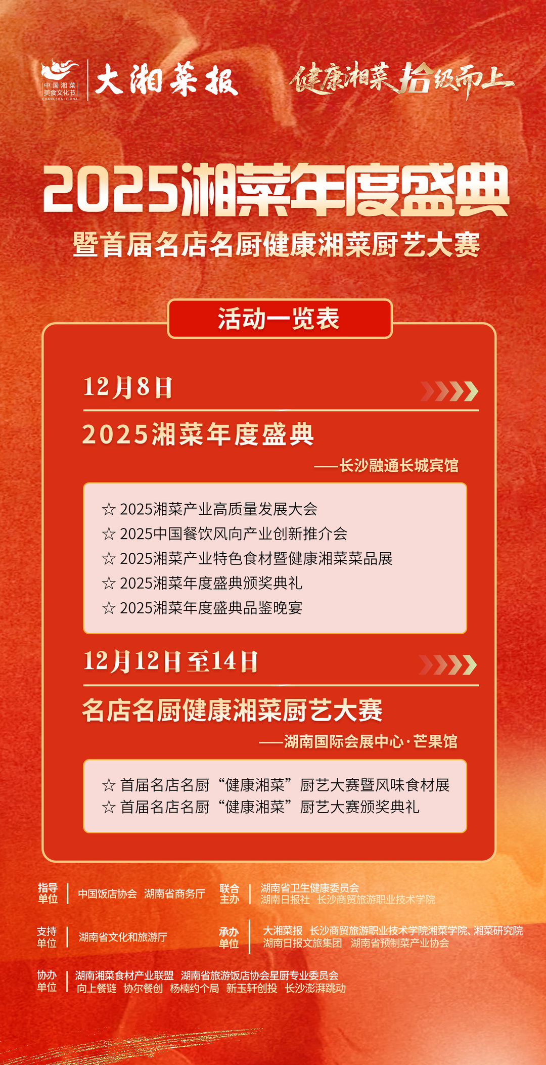 “湘菜年度盛典不仅是一场行业聚会,更是湖南面向全国乃至全球展示‘健康湘菜’新理念、新食材、新模式的战略窗口。”本次盛典组委会负责人表示,欢迎全国餐饮人、供应链伙伴相聚长沙,共同见证湘菜产业在“健康中国”战略引领下迸发的蓬勃活力。
