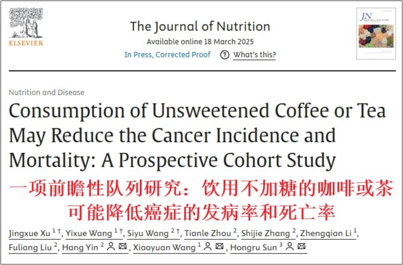 2024年3月,《营养学期刊》上发表的一项研究显示,每天喝2杯或更多的无糖咖啡或无糖茶,能显著降低患癌症和死亡的风险。(一杯约为250毫升)