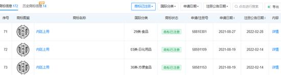 红星资本局在天眼查看到,北京同仁堂兴安保健、北京同仁堂(四川)药业此前在食品、广告销售等多个国际分类下都分别注册了“内廷上用”“朕皇”的相关商标。这两家公司还分别就“内廷上用”“朕皇”相关商标在方便食品、医药等国际分类下申请注册,目前在等待实质审查阶段。