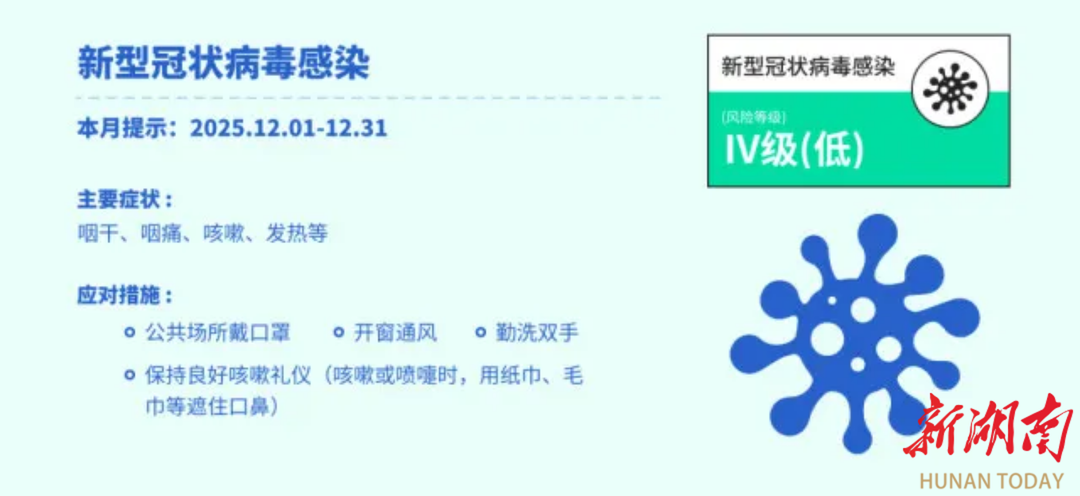 湖南省疾病预防控制中心12月2日发布2025年12月疾病风险综合预报,本月全省防疫指数为Ⅲ级(中),但流行性感冒风险已攀升至最高级别(Ⅰ级),呈现高发态势。