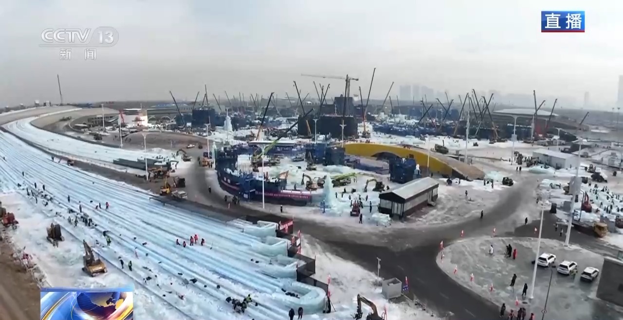 通过航拍镜头视角可以看到,整个冰雪大世界园区非常壮观,所有的冰建项目都已经开工。