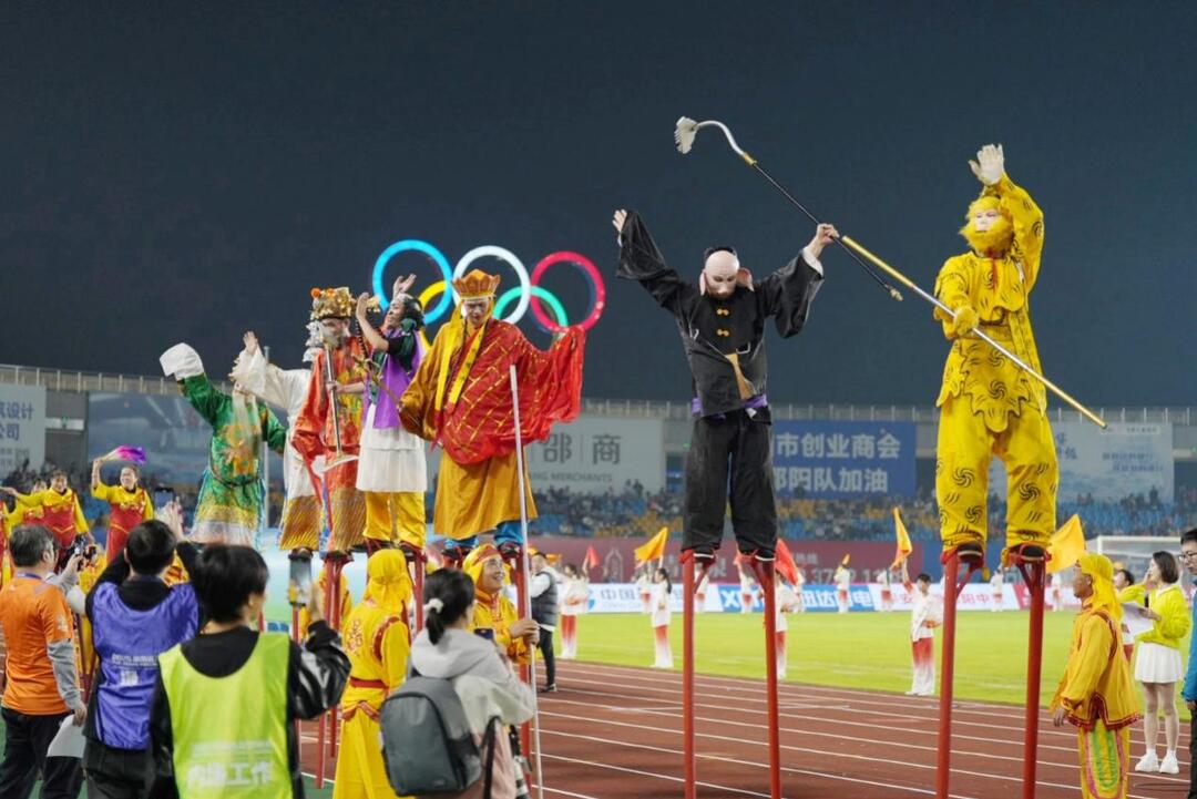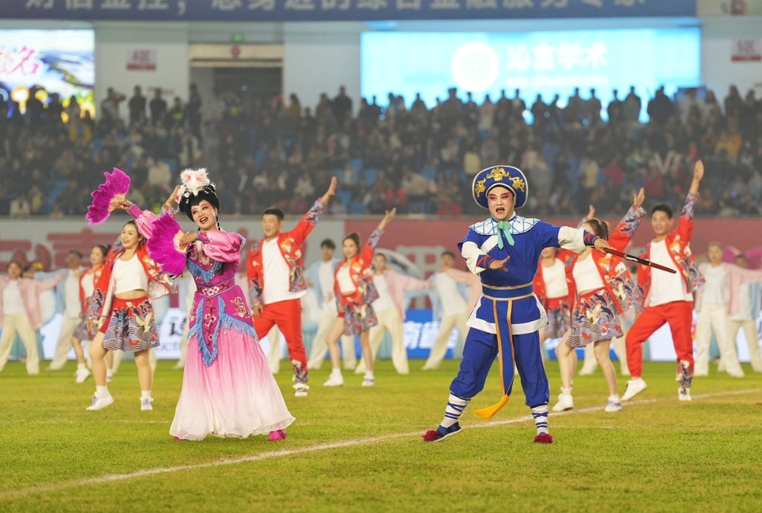 哨声未响,文化已悄然绽放。城步吊龙翻腾起舞,花瑶呜哇山歌响彻云霄。随着赛事推进,一幅邵阳的人文长卷徐徐展开:新邵县的“石马江号子”以粗犷豪迈的呐喊震撼全场,近500名表演者中,300名新邵职中学子虽无舞蹈功底,却用汗水诠释着非遗精神。一位15岁学生磕掉半颗牙仍坚持演出,只为“让更多人听到祖先劳动时的歌声”;洞口县的“雪峰蜜桔”则将赛场变成了甜蜜的海洋,真实桔农杨满玉肩挑蜜桔踏歌而行;《崀山脐橙香》用舞姿讲述从8株母树到50万亩橙园的产业传奇;绥宁苗家姑娘们则舞出了“中国竹子之乡”的万种风情……传统文化的现代表达,在此找到了完美节拍。邵阳花鼓戏《俏花鼓》在保留三百年曲牌韵味的同时,融入了现代节奏,总导演阳阳说:“非遗要焕发生命力,必须与时代脉搏同频共振。”