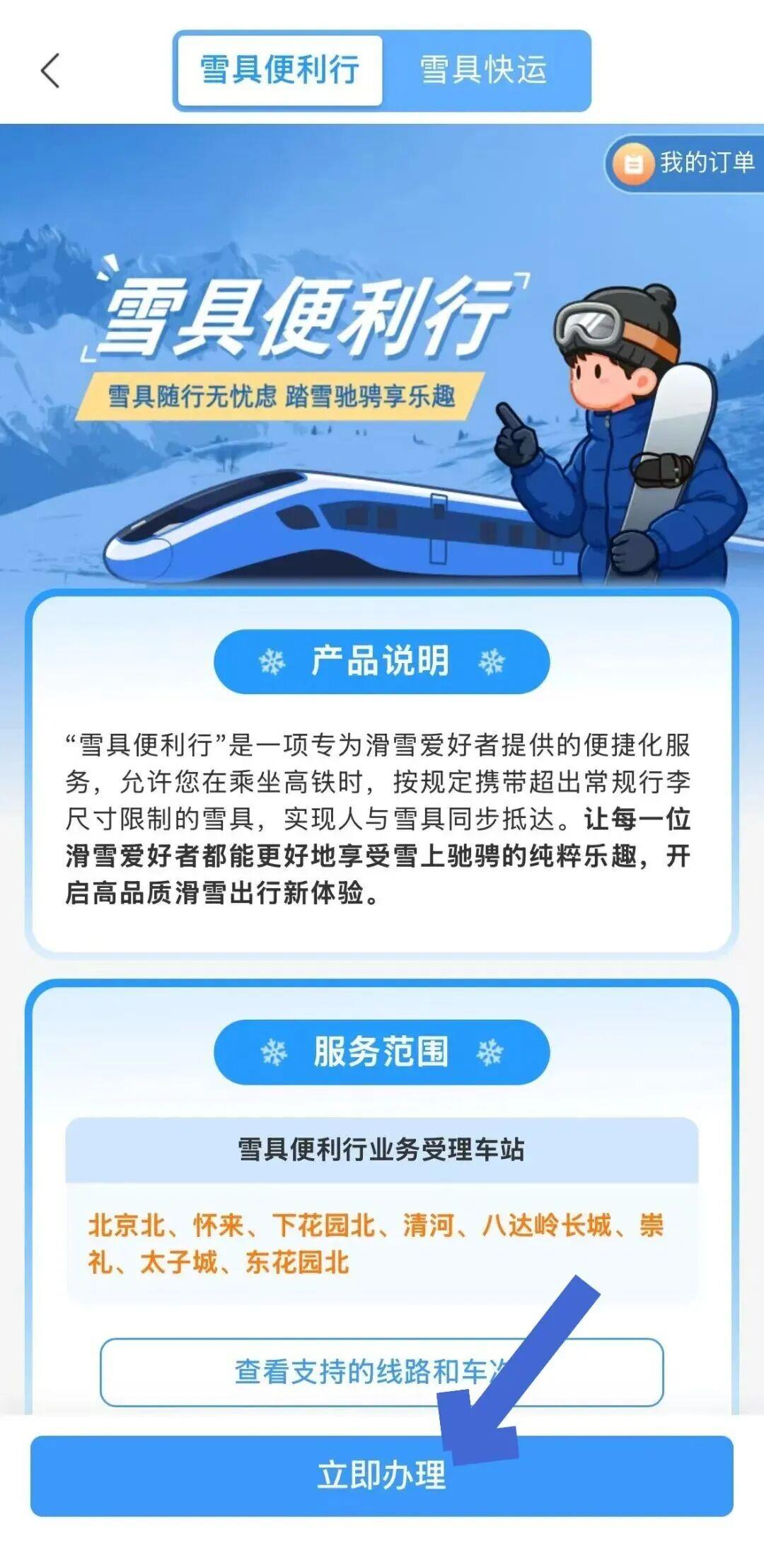 旅客选择该服务后可携带长、宽、高之和不超过200厘米的雪具同车出行,滑雪更加方便快捷。对于长、宽、高之和超过200厘米的雪具,由于高铁列车车内空间限制,仍需办理托运。