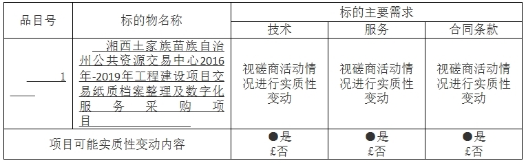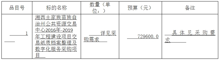 1、采购项目名称:湘西土家族苗族自治州公共资源交易中心2016年-2019年工程建设项目交易纸质档案整理及数字化服务采购项目