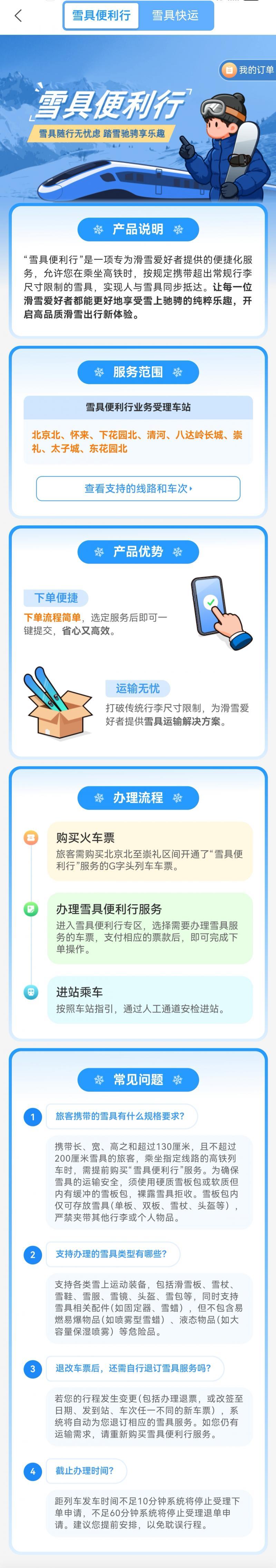 该负责人介绍,携带雪具出行的旅客可通过铁路12306客户端“雪具便利行”功能查询服务信息,购买指定列车车票后,在购票成功页面选择“雪具便利行”服务并预约付费,开车前10分钟停止受理,开车前1小时可取消订单并全额退款。预约成功后,旅客在乘车当日可携带雪具并妥善包装好,通过有“雪具便利行”标识的通道安检、验证,车站工作人员将同步核验旅客车票及服务订单信息、确认雪具包装符合要求后粘贴核验标识;旅客检票上车后,在列车工作人员引导下将雪具妥善放置于邻近的“雪具存放处”;列车运行期间,工作人员将定时巡查,协助保障雪具运输安全。试点初期,“雪具便利行”服务定价为每套68元,支付费用的旅客可在乘车结束后180日内通过铁路12306客户端开具“数字化电子发票”。