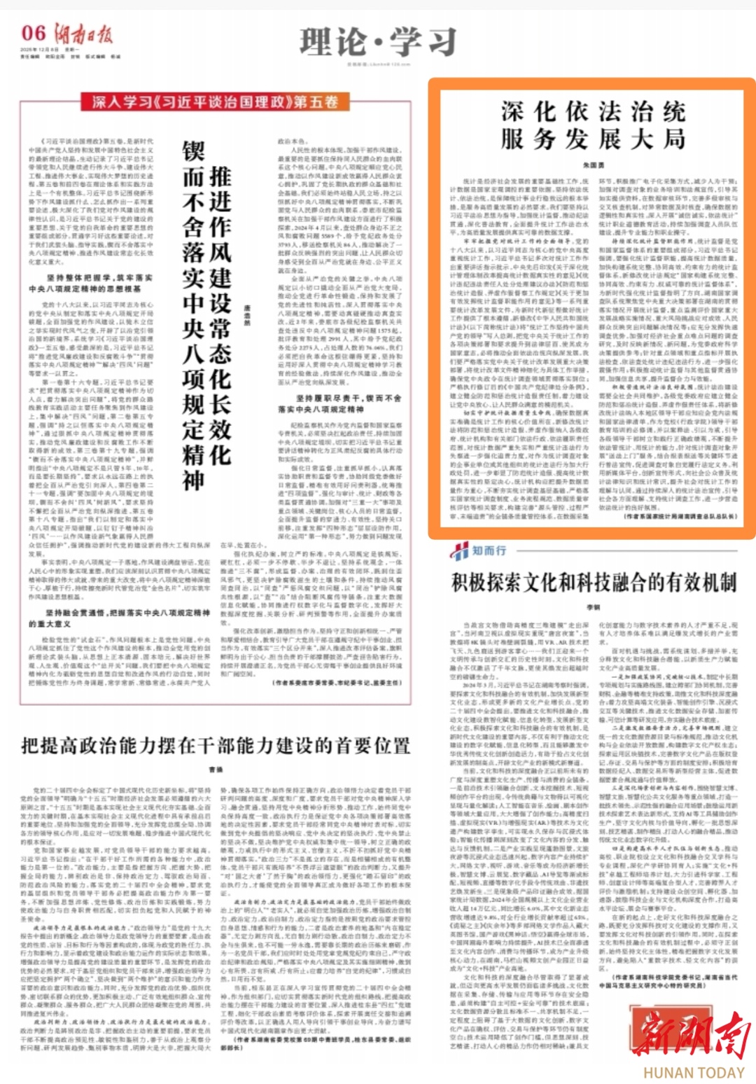 持续深化统计监督职能作用。统计监督是党和国家监督体系的重要组成部分。习近平总书记强调,要强化统计监督职能,提高统计数据质量,加快构建系统完整、协同高效、约束有力的统计监督体系。新修改统计法规定“国家构建系统完整、协同高效、约束有力、权威可靠的统计监督体系”,为新时代强化统计监督指明了方向。湖南国家调查队系统聚焦党中央重大决策部署在湖南的贯彻落实情况开展统计监督,重点监测评价国家重大发展战略实施情况、重大风险挑战应对成效、人民群众反映突出问题解决情况等;应充分发挥快速调查优势,加强对经济社会重点难点问题的调查研究,及时反映新情况、新问题,为党委政府科学决策提供参考;针对重点领域和重点指标开展执法检查,依法查处统计违纪违法行为,进一步强化震慑作用;积极推动统计监督与其他监督贯通协同,加强信息共享,提升监督合力与效能。