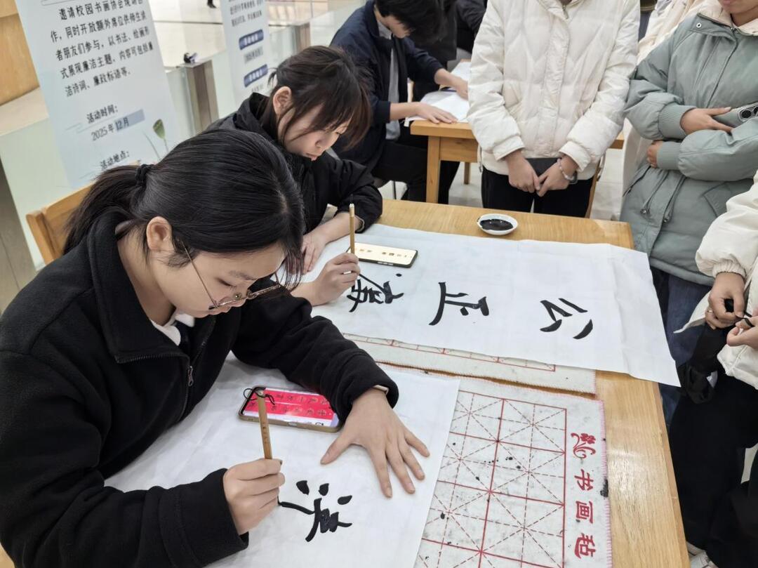 在“妙笔书廉”创意作品创作区,图书馆联合书法协会,现场笔墨飘香。师生书法爱好者们挥毫泼墨,以笔言志、以墨抒怀,一幅幅以廉洁警句、格言为内容的书法作品跃然纸上,苍劲有力的字迹传递着崇廉尚洁的价值理念,将传统艺术形式与廉洁文化教育生动融合。