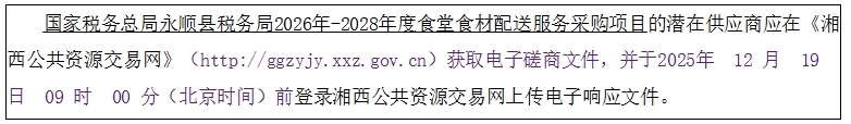 原链接:[竞争性磋商]国家税务总局永顺县税务局2026年-2028年度食堂食材配送服务采购项目[正在下载]
