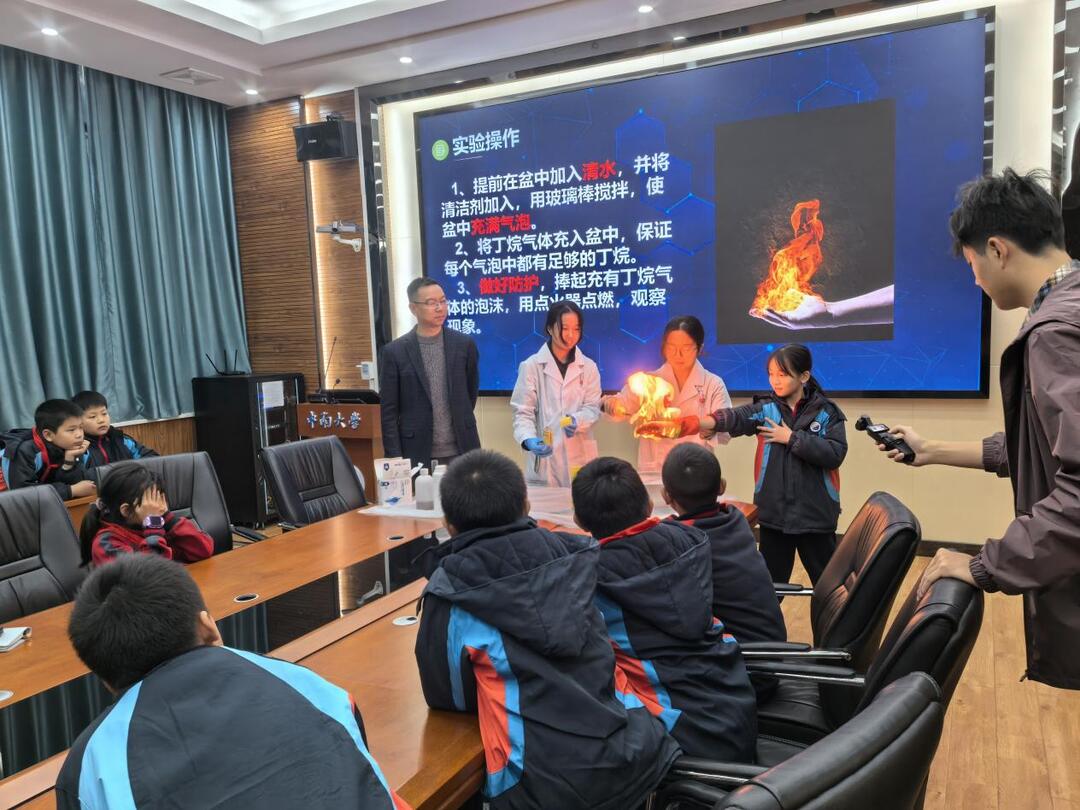 实验室参观的高潮是一场别开生面的“趣味科学实验秀”。徐海教授亲自示范“丁烷泡泡”实验:将丁烷气体充入洗涤剂泡沫中,点燃后火焰瞬间绽放,却未灼伤操作者皮肤。这一神奇现象生动诠释了气体可燃性、密度与燃烧反应的化学原理,引得学生们阵阵惊呼。实验将抽象知识转化为触手可及的奇妙体验,点燃了少年们心中的科学热情。