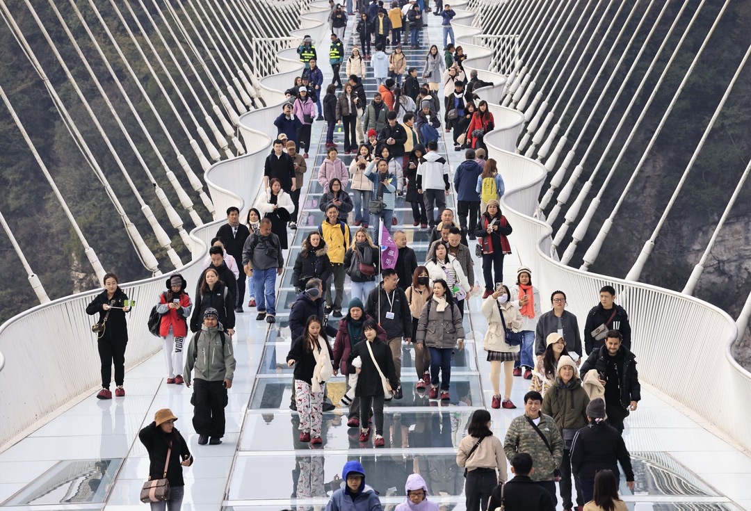 12月7日,中外游客在湖南张家界市大峡谷风景区体验高空玻璃桥。 冬日的湖南张家界市大峡谷风景区,阳光明媚,中外游客纷至沓来,体验“云端漫步”的高空玻璃桥游览项目,享受休闲旅游的乐趣。 (吴勇兵 罗克文摄影报道)