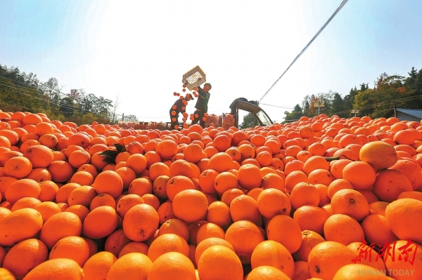12月7日,龙山县里耶镇比耳村,果农在堆放采摘的里耶脐橙。趁着连日晴好天气,当地果农加紧对里耶脐橙进行采摘、分级、包装,确保新鲜优质的果实及时供应市场。