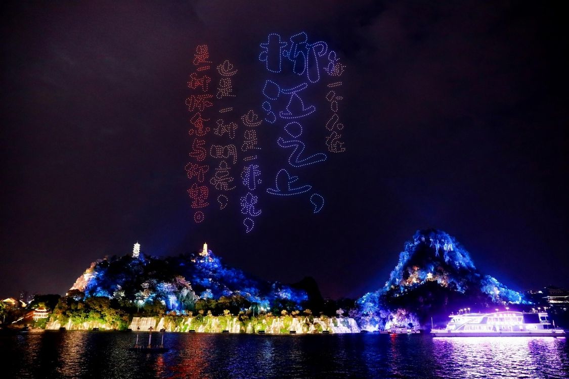 无人机群在柳江上“画”出桂林象鼻山。