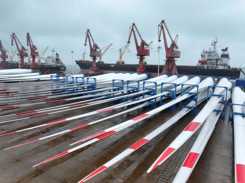 ▲2025年10月13日,在江苏省连云港港东方港务分公司码头,大批风电设备集港准备装船出口国外(无人机照片)。新华社发(王春 摄)