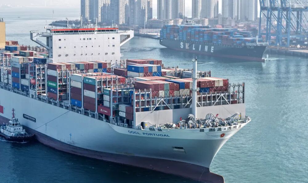 ▲2025年12月4日,货轮进出山东港口青岛港前湾港区(无人机照片)。新华社记者 李紫恒 摄