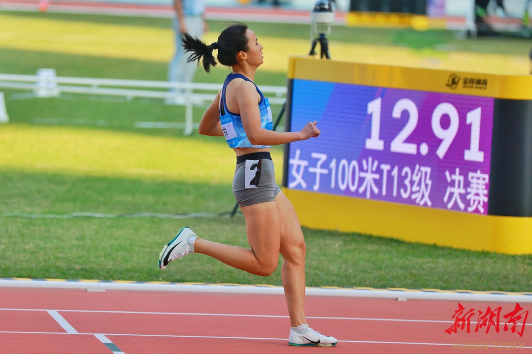 近年来在国际国内各大赛事中斩获10余枚金牌的耒阳妹子朱琳则在女子100米T13级决赛中,以12秒91的成绩为湖南队再夺一金。