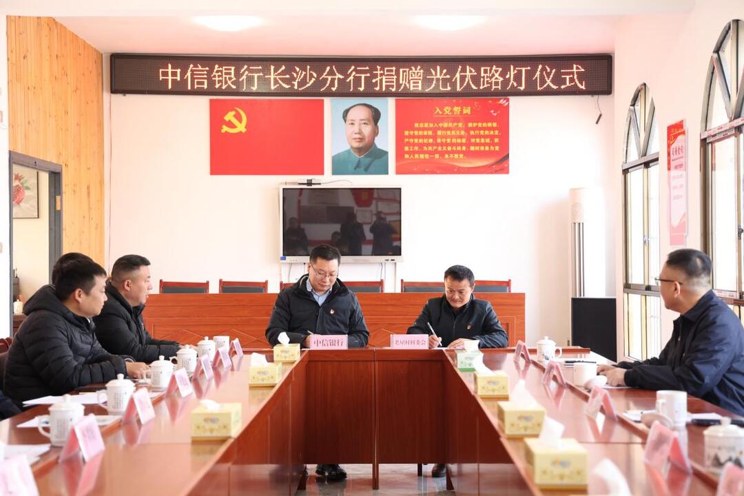 仪式上,湖南京能新能源科技有限公司、中信银行长沙分行先后与老屋村签署捐赠协议。根据协议,京能公司向老屋村捐赠5台充电桩设备,用于建设新能源汽车充电点;中信银行长沙分行向老屋村捐赠光伏路灯40盏,主要安装在村内主干道、村民集中居住区域及通往村活动中心等关键路段,改善村民生活环境。老屋村党支部书记对中信银行长沙分行和京能新能源科技有限公司的支持表达了诚挚感谢,并表示这些项目不仅是壮大村集体经济、带来持续收益的有效途径,更是基层党组织引领推动“双碳”目标落地、践行绿色发展理念的具体行动,未来将为老屋村可持续发展提供坚实支撑。