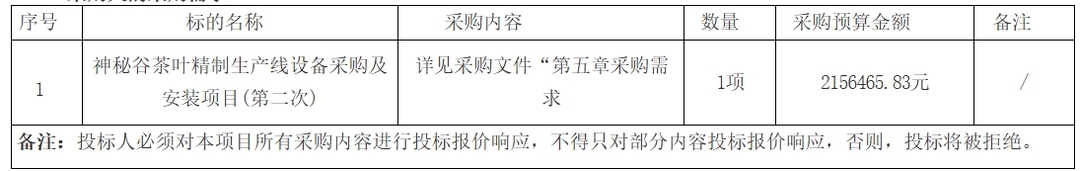 1.采购项目名称:神秘谷茶叶精制生产线设备采购及安装项目(第二次)