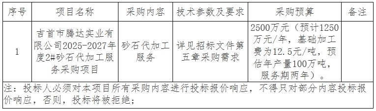 1、采购项目名称:吉首市腾达实业有限公司2025-2027年度2#砂石代加工服务采购项目