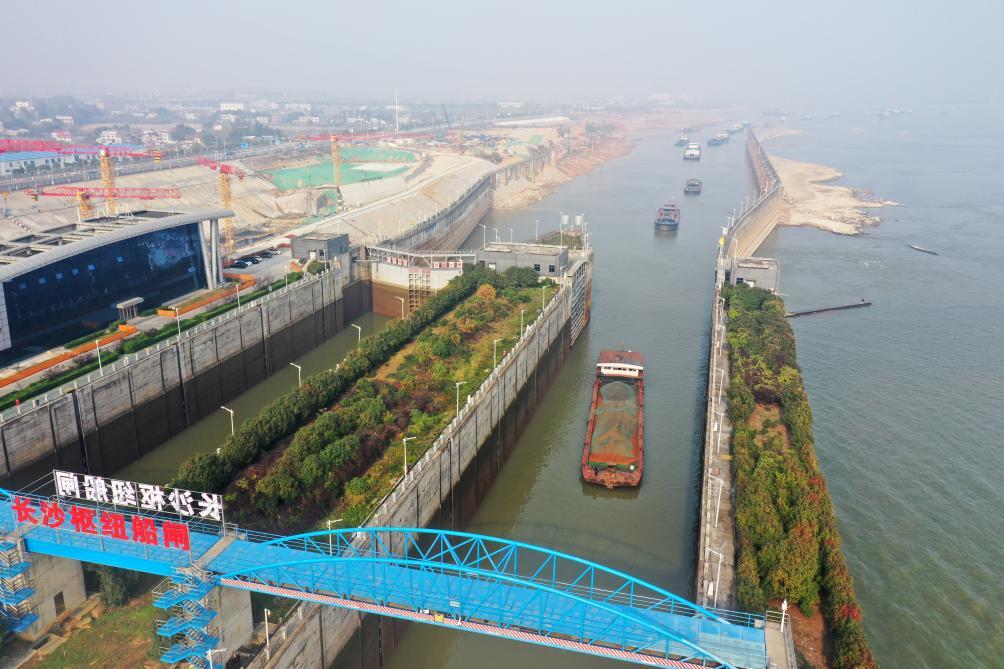 12月9日,湘江航电枢纽船闸,船舶正排队过闸