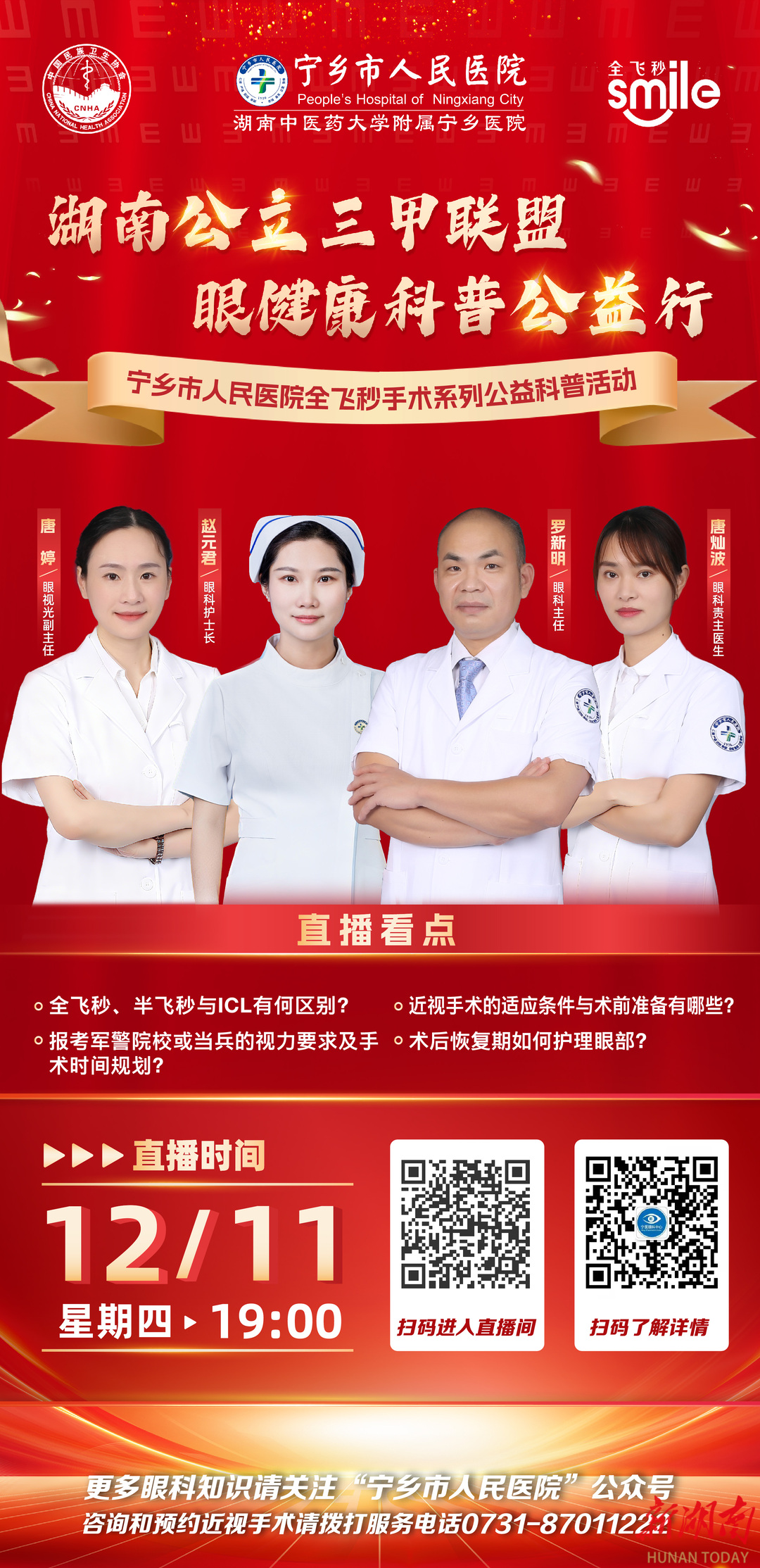 活动还将分享真实手术案例,增强公众对现代屈光手术的信心。宁乡市人民医院作为湖南中医药大学附属宁乡医院及湖南省16家三甲公立医院共同组建眼健康科普公益联盟的重要成员,持续致力于眼健康公益科普与医疗服务提升。诚邀广大市民、近视群体及关注眼健康人士扫码观看直播,与专家实时互动,共赴一场关于清晰视界的健康之约。更多眼科科普内容与服务信息,可关注“宁乡人民医院”官方微信公众号,或拨打咨询预约电话:0731-87011222。