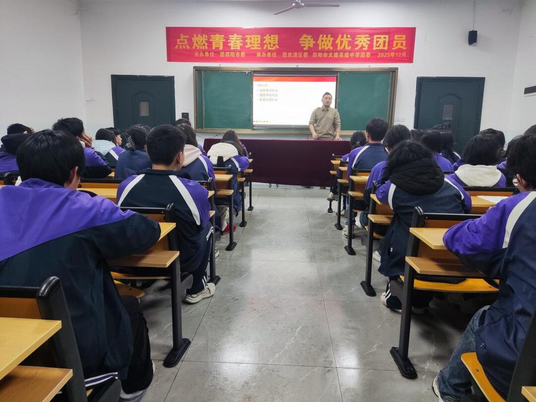 团旗飘扬聚心力,青春梦想启新篇。12月8日,由共青团邵阳市委主办,团双清区委、邵阳市文德高级中学团委承办的“点燃青春理想 争做优秀团员”主题团课教育活动走进邵阳市文德高级中学。邀请全国优秀共青团员段振晖担任主讲,120名团员代表及发展对象齐聚一堂,共同接受了一次深刻的思想淬炼和精神洗礼。活动现场,段振晖围绕共青团的光辉历程、青春的奉献担当、政治的忠诚感恩等核心主题与同学们展开生动的讲述和真切的互动,在青年学子心中播下了奋发向上的种子。
