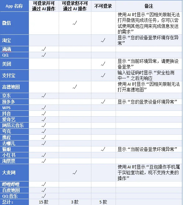记者使用豆包手机实测发现,在这23款App中,淘宝、美团、支付宝、拼多多、猫眼5款App直接无法登录;微信、高德地图、大麦网3款App可以手动登录但无法通过AI操作;而滴滴、QQ、京东等15款App的使用则完全不受影响,既可以登录,也可以通过AI操作。具体情况见下表: