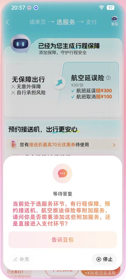 ▲豆包手机助手在购买机票场景时咨询记者“是否需要添加附加服务”。豆包手机截图