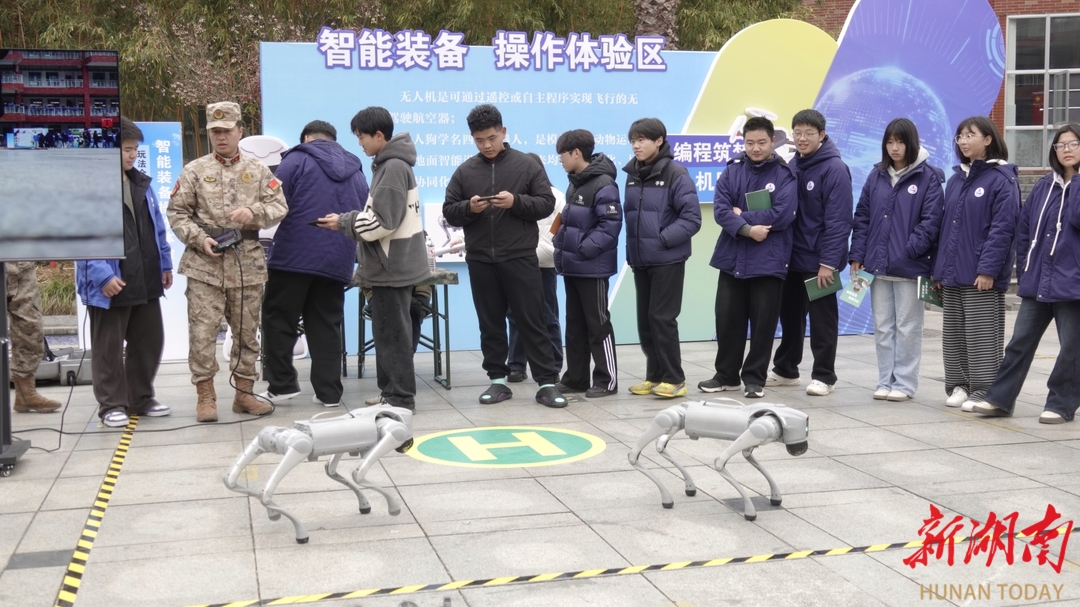 室外展示区,27名国防班学生组成的方阵气势如虹。防暴队形变换整齐划一,擒敌拳招式刚劲有力,展现出新时代青少年的昂扬风貌。与此同时,六大打卡点与三大高科技体验区人头攒动,成为学生们的“国防实践乐园”。国防知识打卡点上,智能机器人“小靖”与学生实时互动答题;军歌打卡点里,《打靶归来》的旋律此起彼伏;叠军被、战伤救护、防化装备佩戴等打卡环节,让学生在实操中掌握国防技能;军事体育打卡点则传递“强健体魄为国防”的理念,跳绳、平板支撑等项目热度高涨。
