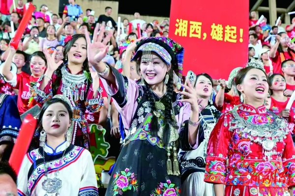 10月11日晚,凤凰县巾帼文旅志愿者在“湘超”赛场为足球健儿加油助力。吴东林 摄