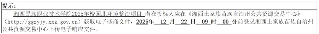 1、提交投标文件的截止时间:2025年12 月22 日09 时00 分(北京时间);请投标人登录《湘西土家族苗族自治州公共资源交易中心》(http://ggzyjy.xxz.gov.cn)下载电子投标文件制作工具编制投标文件,投标人应在投标截止时间前通过电子招标投标交易平台上传数据电文形式的电子响应文件。逾期递交的响应文件,电子招标投标交易平台予以拒收。