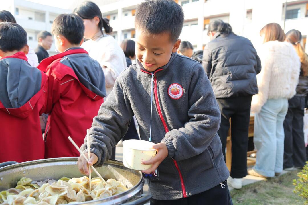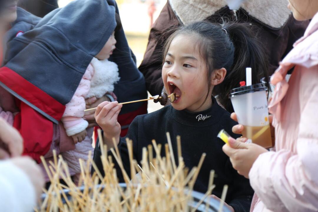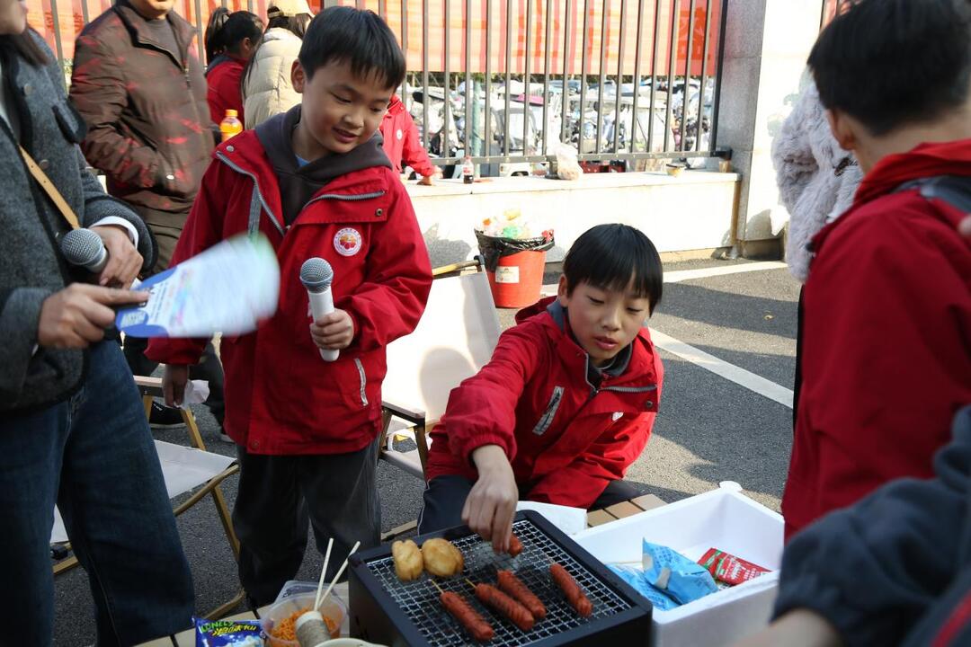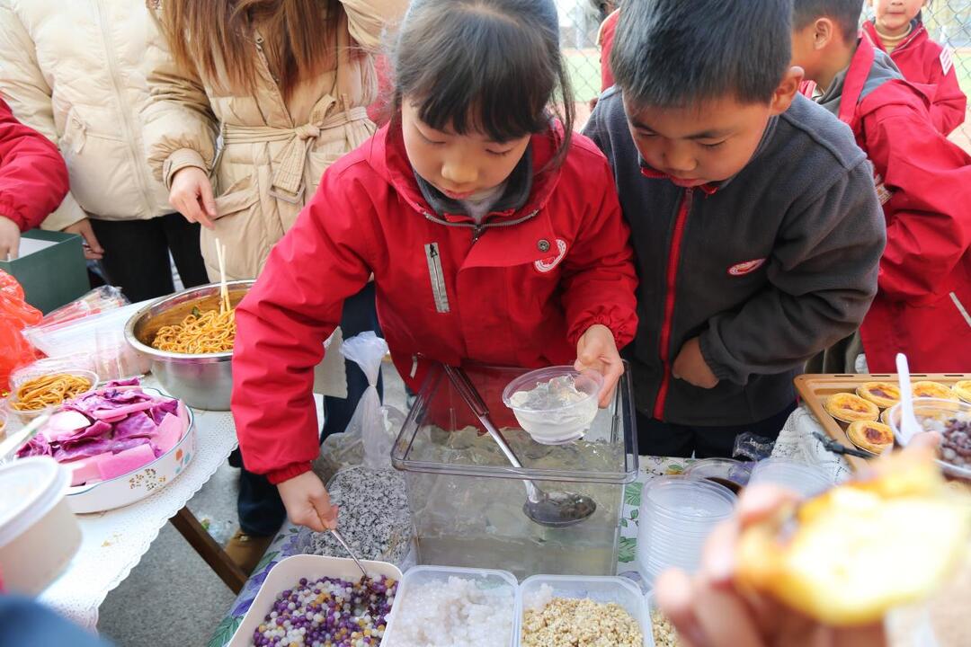 “卖擂茶咯!新鲜出炉的擂茶,快来尝一尝呀!”六年级摊位前,学生小胡搓着手热情地吆喝着,小李专注搅拌擂茶,木槌敲陶钵的咚咚声里,芝麻香混着花生碎漫开。“我们的烤鸡翅采用独家秘制配方,运用多种香料精心腌制,品质上乘、风味独特,食用过后令人回味无穷、欲罢不能。”另一组烤鸡翅摊的学生自豪地介绍。现场陈列着手工制作的饺子、造型憨态可掬的水果糖葫芦、清甜宜人的椰子冻等丰富多彩的美食。学生们有序穿梭于各个摊位之间,尽情品尝着各自钟爱的美食,从传统的风味小吃到富有创意的甜品,从精致的点心到美味的佳肴。一道道色、香、味俱全的美食令人应接不暇,每一口都仿若在品味校园生活的甜蜜与愉悦。