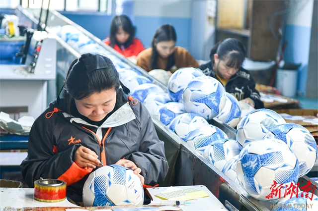 On December 9, all production lines in a workshop at a company located in the Loudi Economic and Technological Development Zone operated at full capacity as workers were busy fulfilling football orders to meet the growing demand in both domestic and international markets. The company is a renowned sporting goods manufacturer. Its products are exported to over 100 countries and regions, including the United States and Germany. (Photo/Wu Yonghua)