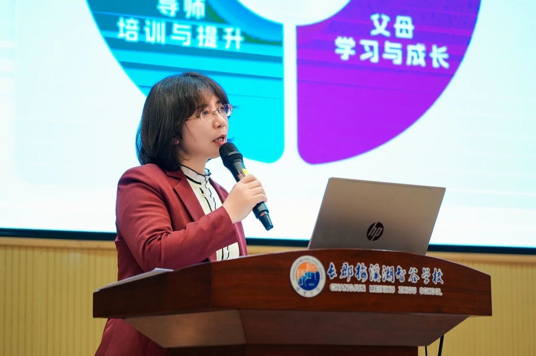 活动伊始,长郡梅溪湖智谷学校党支部书记阳灿致欢迎辞,介绍了学校在家庭教育方面的实践与规划。新区教育局家庭教育指导中心副主任、南片负责人、长郡梅溪湖智谷学校校长张素梅以《追光 聚光 成为光》为题,从三个维度系统阐述了整体规划、工作思路,并提出了“一体四驱”工作体系,共创孩子健康、家庭幸福、社会和谐美好未来。