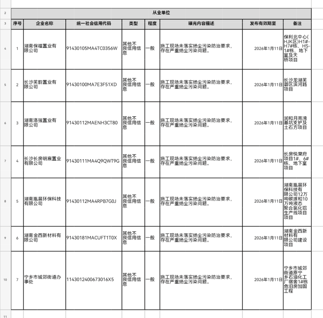 此次被曝光的单位包括湖南保福置业有限公司、长沙芙韵置业有限公司、湖南洛强置业有限公司、长沙长房明宸置业有限公司、湖南胤晨环保科技有限公司、湖南金西新材料有限公司及宁乡市城郊街道办事处。上述单位均未严格执行施工现场扬尘污染防治相关规定,引发扬尘污染问题,造成不良影响。