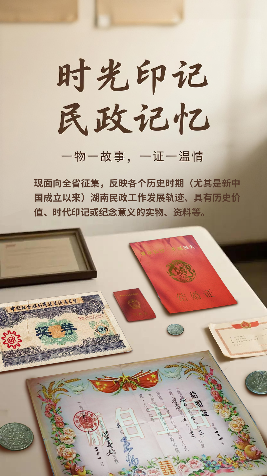 凡能反映各个历史时期(尤其是新中国成立以来)湖南民政工作发展轨迹、具有历史价值、时代印记或纪念意义的实物、资料等,均在征集之列。