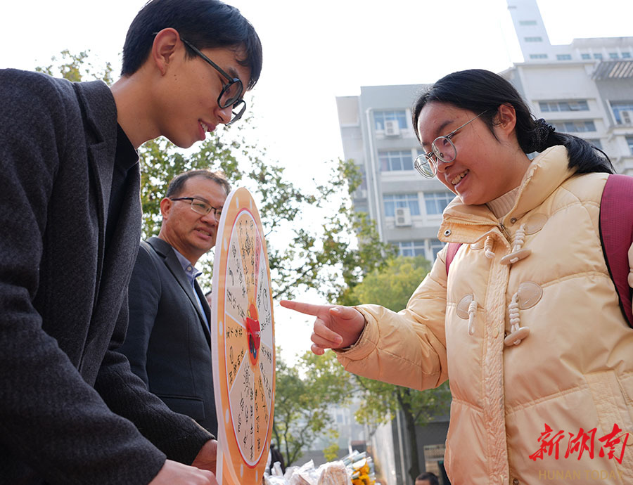 12月10日,南华大学衡阳医学院学生转动考研上岸幸运大转盘。2026年全国硕士研究生招生考试临近,该校特别为备考考生组织了一系列丰富多彩的减压活动,并给同学们送上鲜花、水果、吉祥物等礼品,帮助考生释放压力,调整心态,以最佳状态迎接考试。曹正平 陈文 摄影报道(湖南图片库)