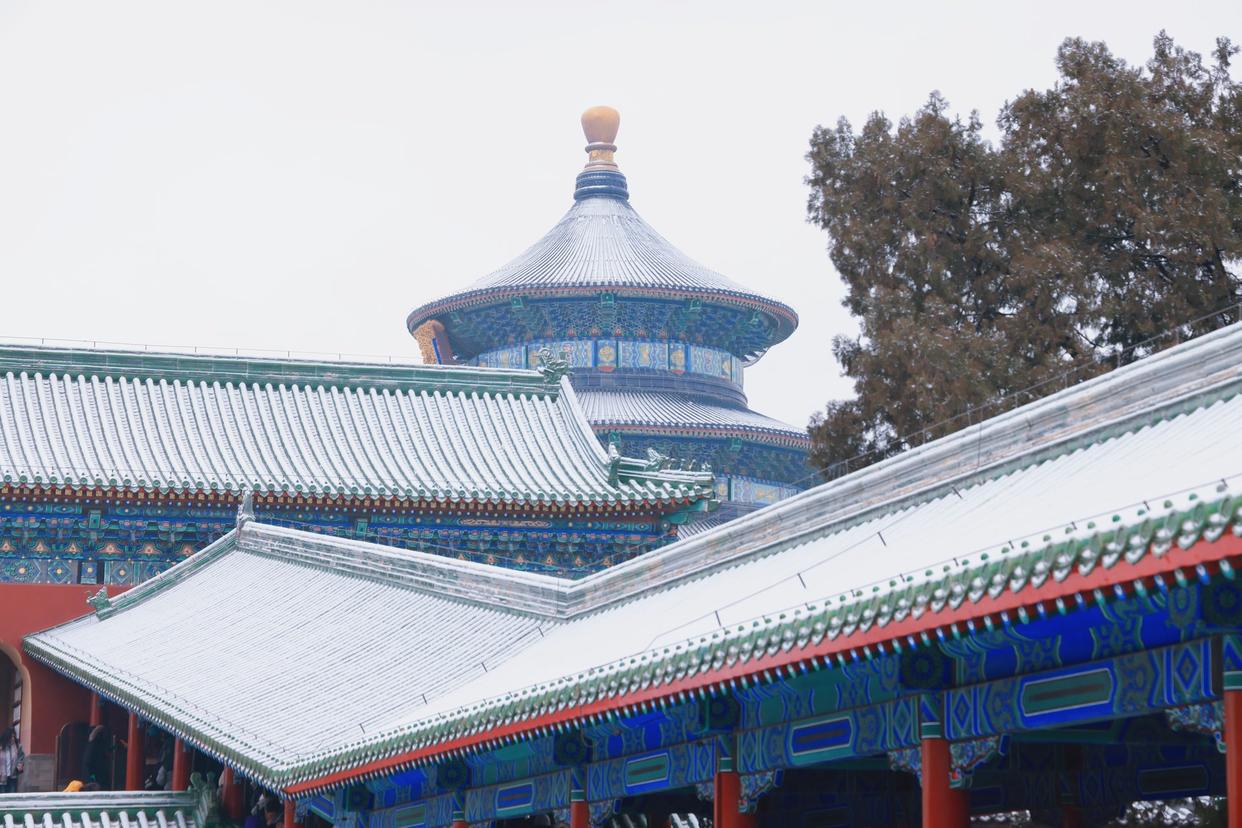 12月12日,北京的初雪为天坛公园增添了银白色彩,园内的古建和树木都披上了新装。