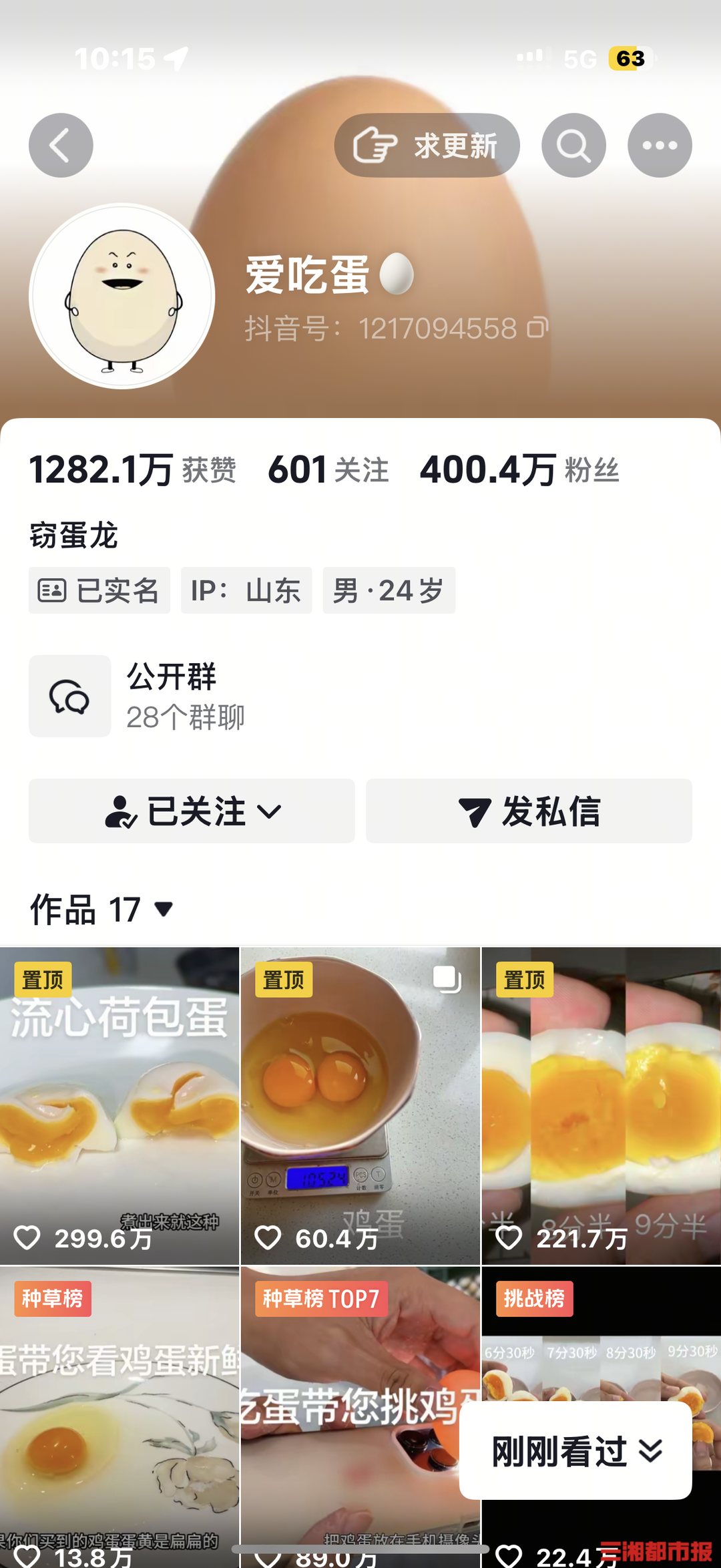 12月4日,冯昌绪发布了第一条煮蛋相关视频,短短一周他发布的15条视频共收获了超千万的点赞。“完全没料到会这么火,最开始涨粉快的时候,心里特别慌。”回忆起流量爆发的最初几天,冯昌绪坦言意外。