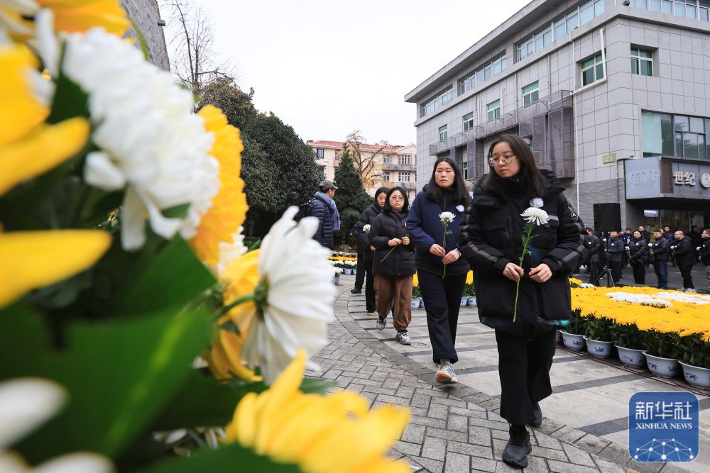 ↑12月13日,在位于江苏南京的侵华日军南京大屠杀死难同胞丛葬地(正觉寺),人们向遇难同胞纪念碑献花。新华社发(苏阳摄)
