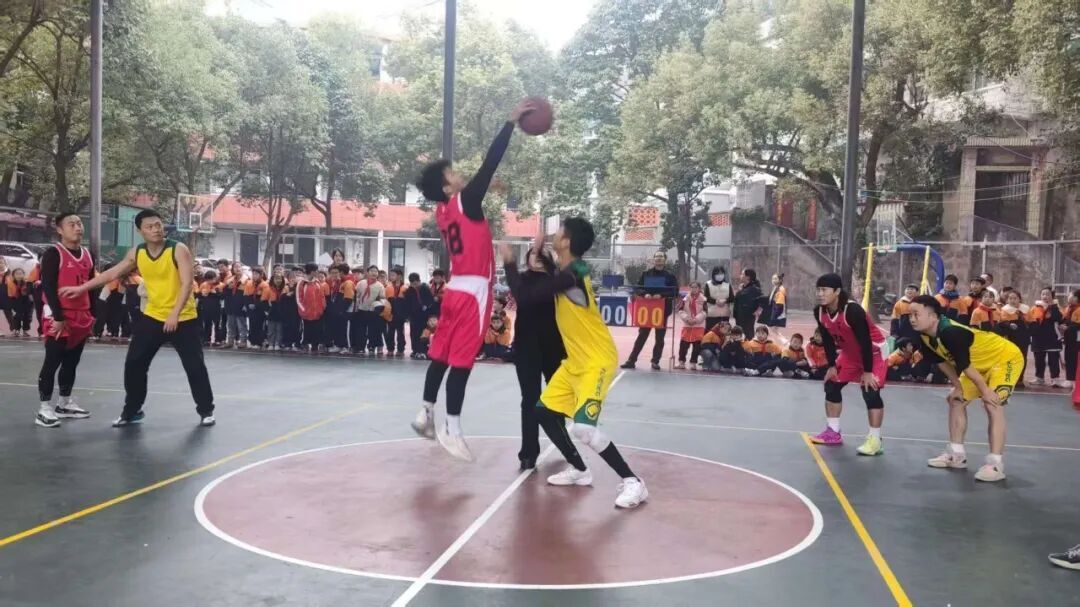 学校的风雨球场内迎来首场对决——三年级组VS党群联队。队员们运球、传球、投篮,一招一式充满朝气;场边啦啦队呐喊助威,掌声与欢呼此起彼伏。
