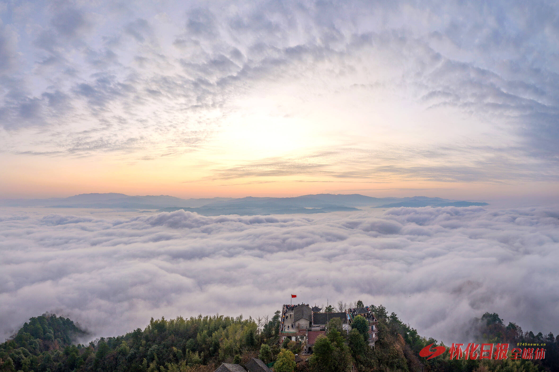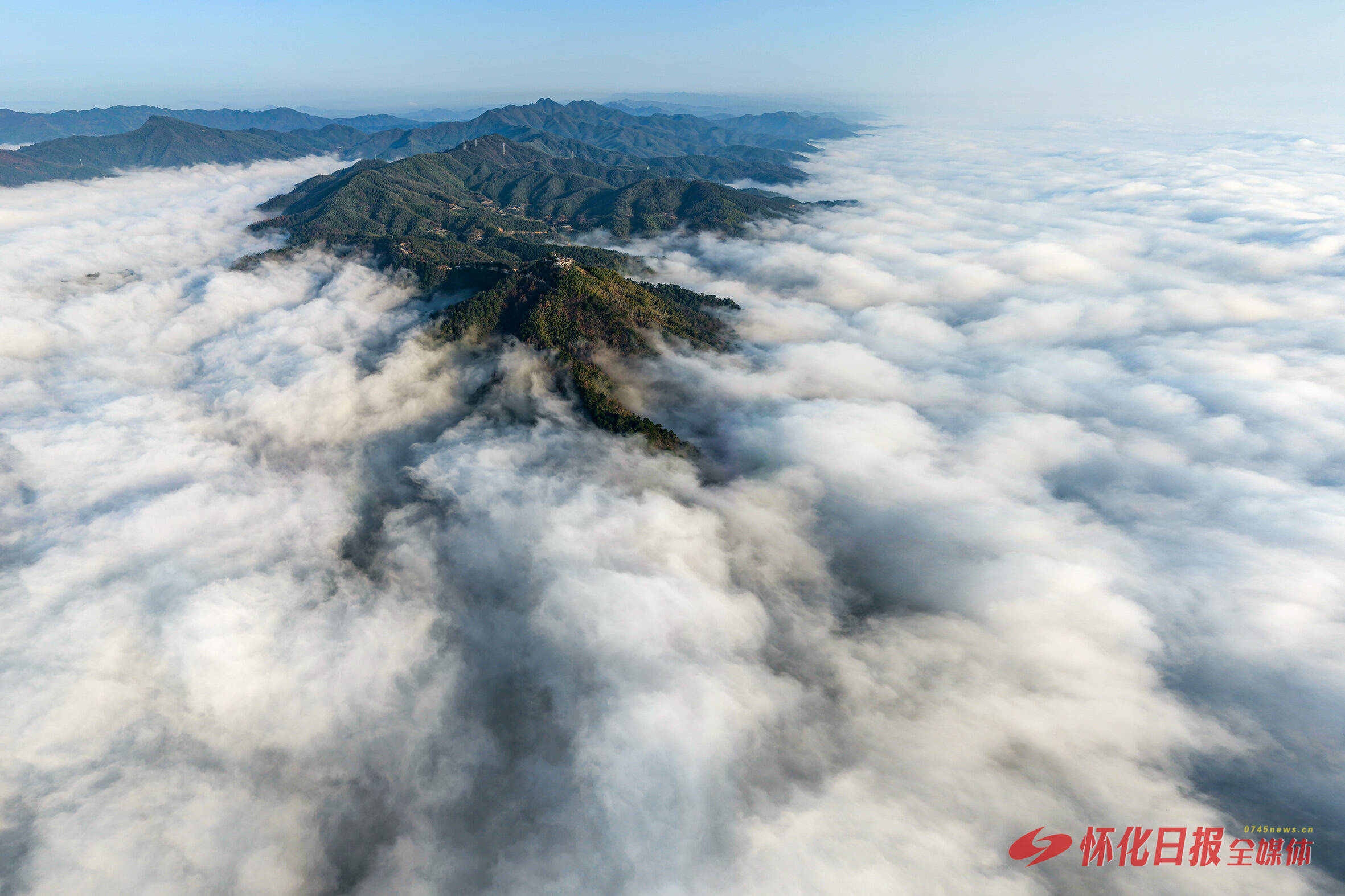 12月14日,航拍下的密岩尖云海格外壮丽。据了解,洪江区密岩尖是一处自然观景胜地,仅需十几分钟的登山时间就可以俯瞰滔滔沅江及群山环绕的洪江古商城全貌。(李钢 摄)