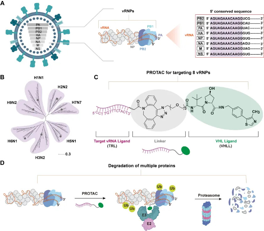 这种设计使得该分子如同一位“特洛伊木马”,进入被感染的细胞后,能同时钩住病毒复制核心——病毒核糖核蛋白复合体和细胞的“粉碎机”,从而为病毒的核心蛋白打上“销毁”标记,进而引导细胞机器将这些病毒复制的关键零件彻底降解,从源头上摧毁病毒的复制能力。
